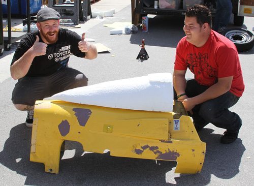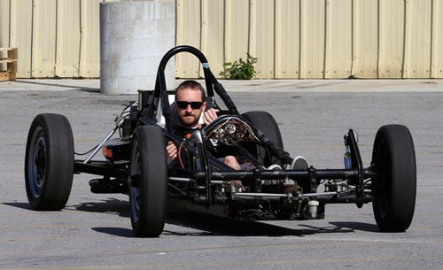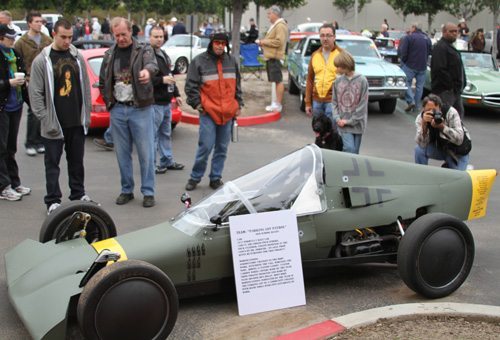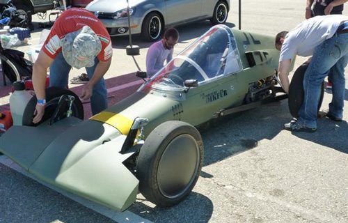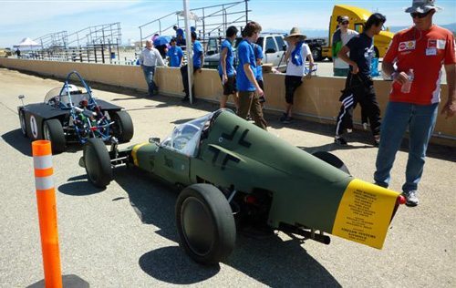 Students from our first manufacturing processes class decided to enter a automobile efficiency contest sponsored by a local university. One student offered the use of a vintage formula V race car and the project was on. The body was heavily modified, carbon fiber wheel disks (including tooling) were made and enclosed canopy built all in less than 40 hours total time.